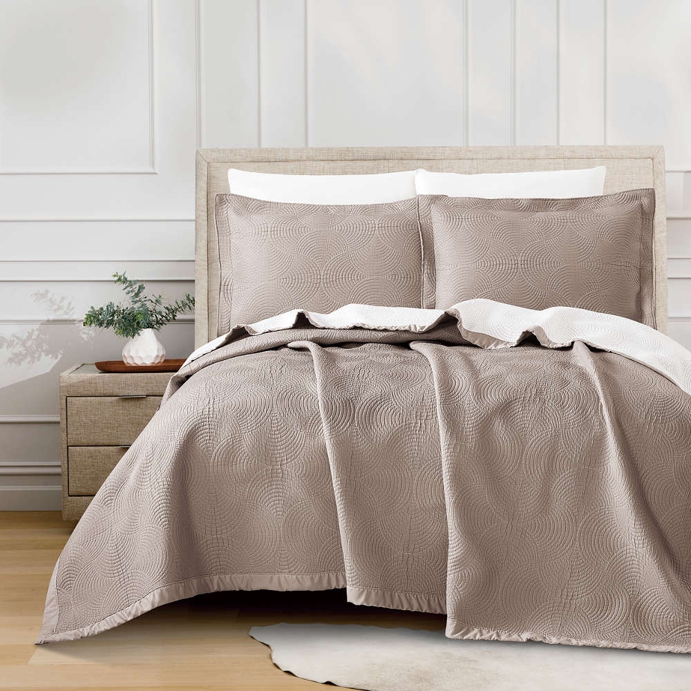 <p>Σετ κουβέρτα καλοκαιρινή πολυτελείας υπέρδιπλη με μαξιλαροθήκες oxford style από ύφασμα ζακάρ, 100% πολυέστερ, με γραμμικό σχέδιο και μονόχρωμη φάσα, σχέδιο κύκλοι, χρώμα μπεζ.</p>