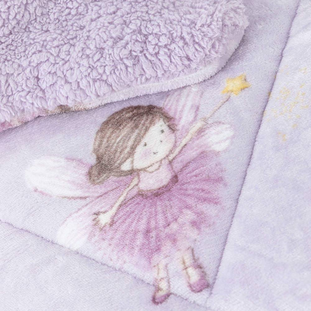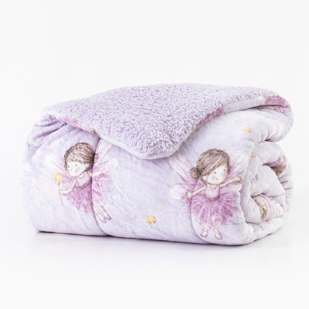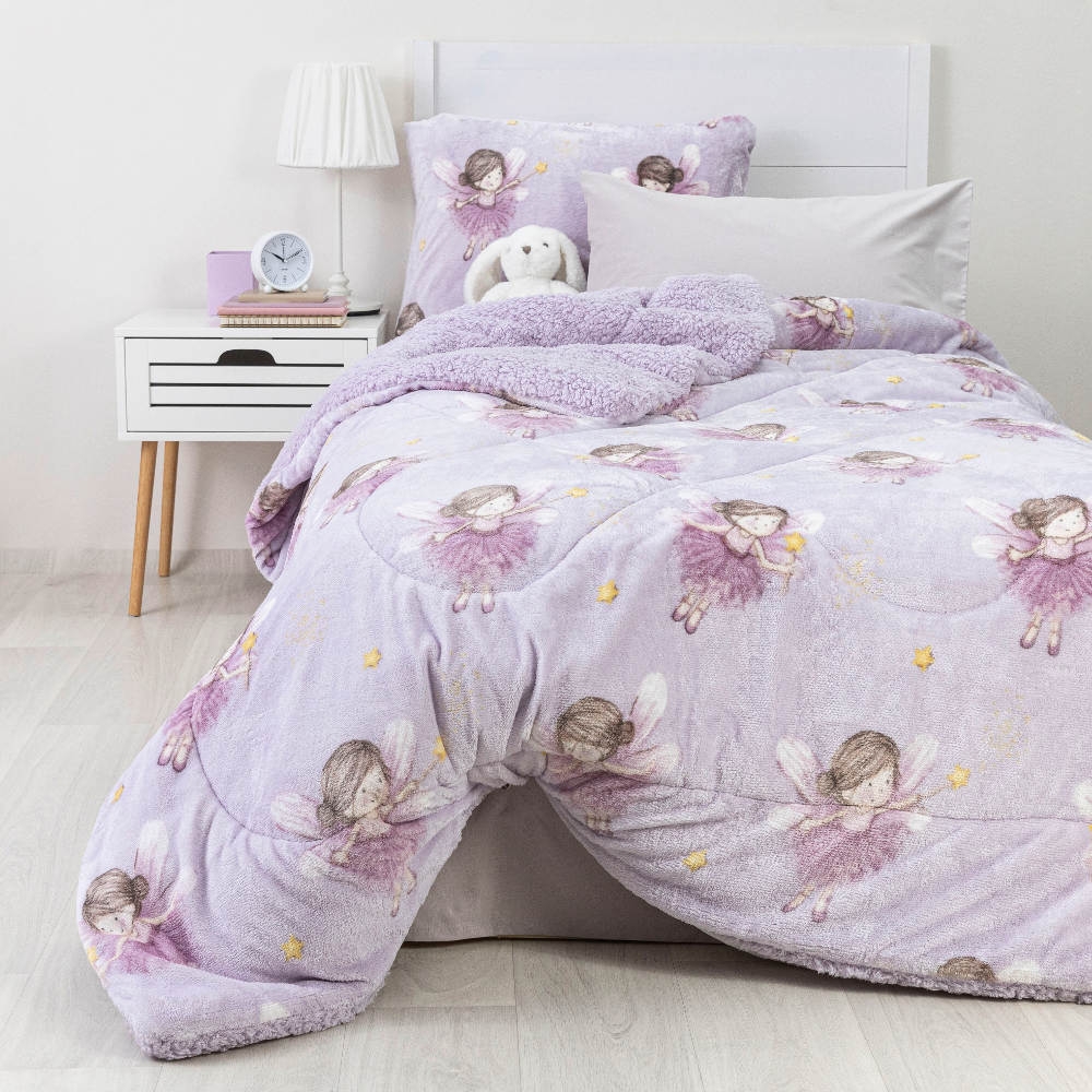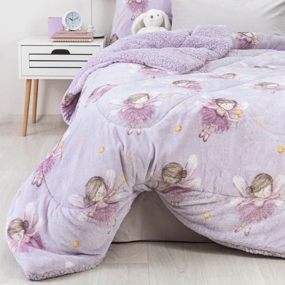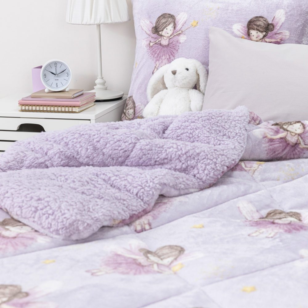 <p>Κουβερτοπάπλωμα μονό φλάνελ, 100% πολυέστερ, εμπριμέ, λιλά, σχέδιο με νεραϊδούλες, με επένδυση προβατάκι sherpa (Χωρίς μαξιλαροθήκη).</p>