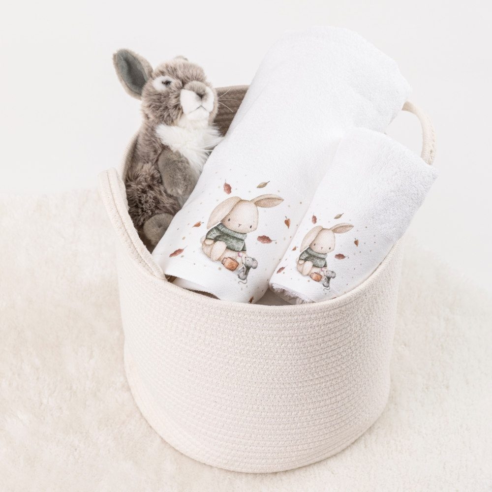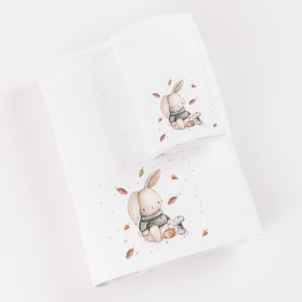 <p>Σετ πετσέτες 2 τεμαχίων, μπάνιου και χειρός, από ύφασμα φροτέ πενιέ, 100% βαμβακερό, μονόχρωμο, λευκό, με ψηφιακή εκτύπωση, σχέδιο λαγουδάκι.Διατίθεται σε 2 χρώματα.</p>