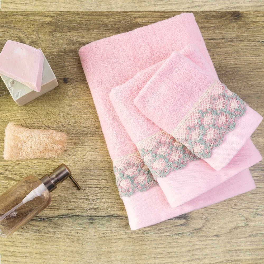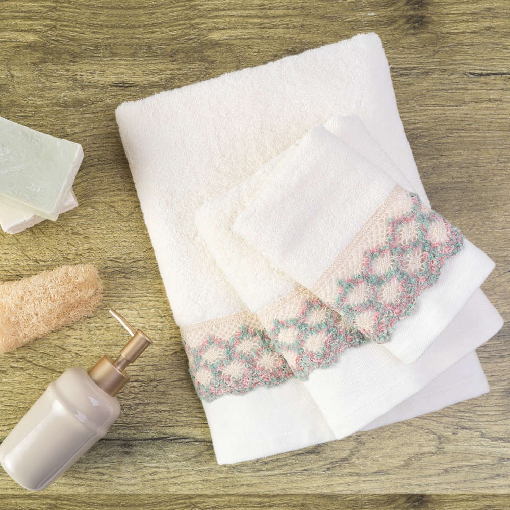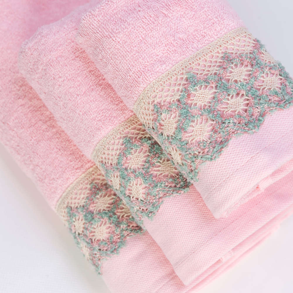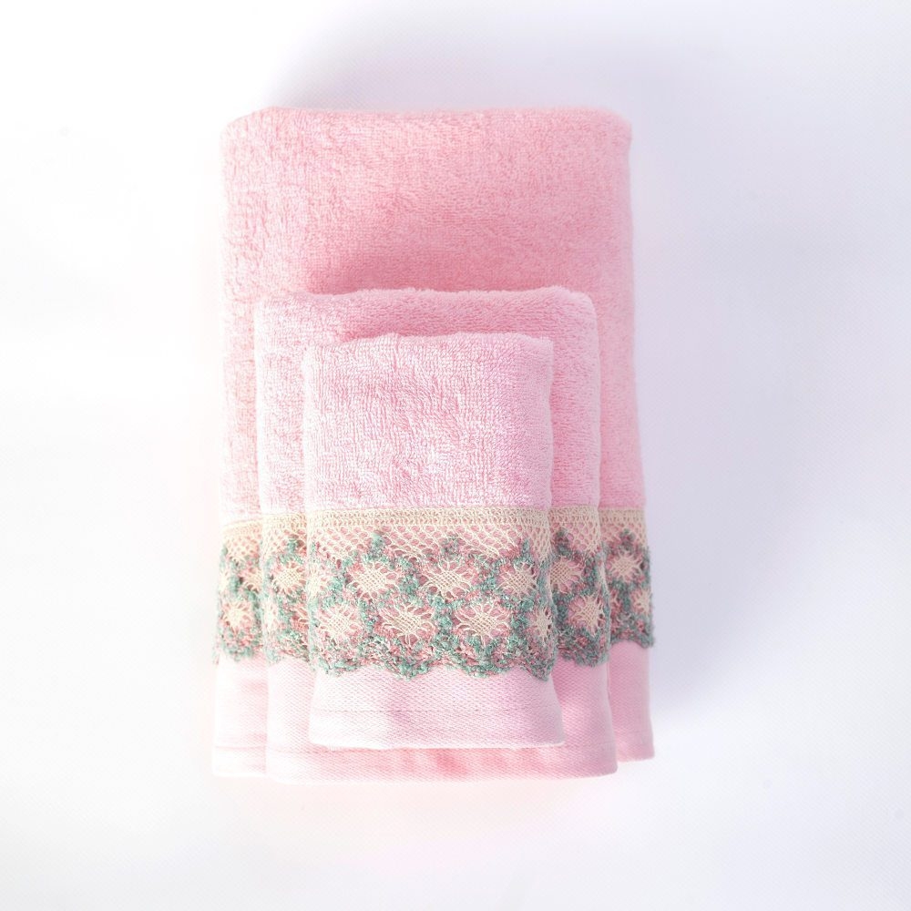 <p>Σετ πετσέτες 3 τεμαχίων, μπάνιου, προσώπου και χειρός, από ύφασμα φροτέ, πενιέ, 100% βαμβακερό, με διακοσμητική πλεχτή δαντέλα.Διατίθεται σε 3 χρώματα.</p>