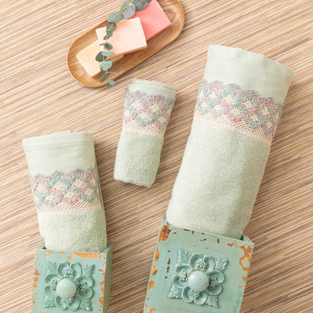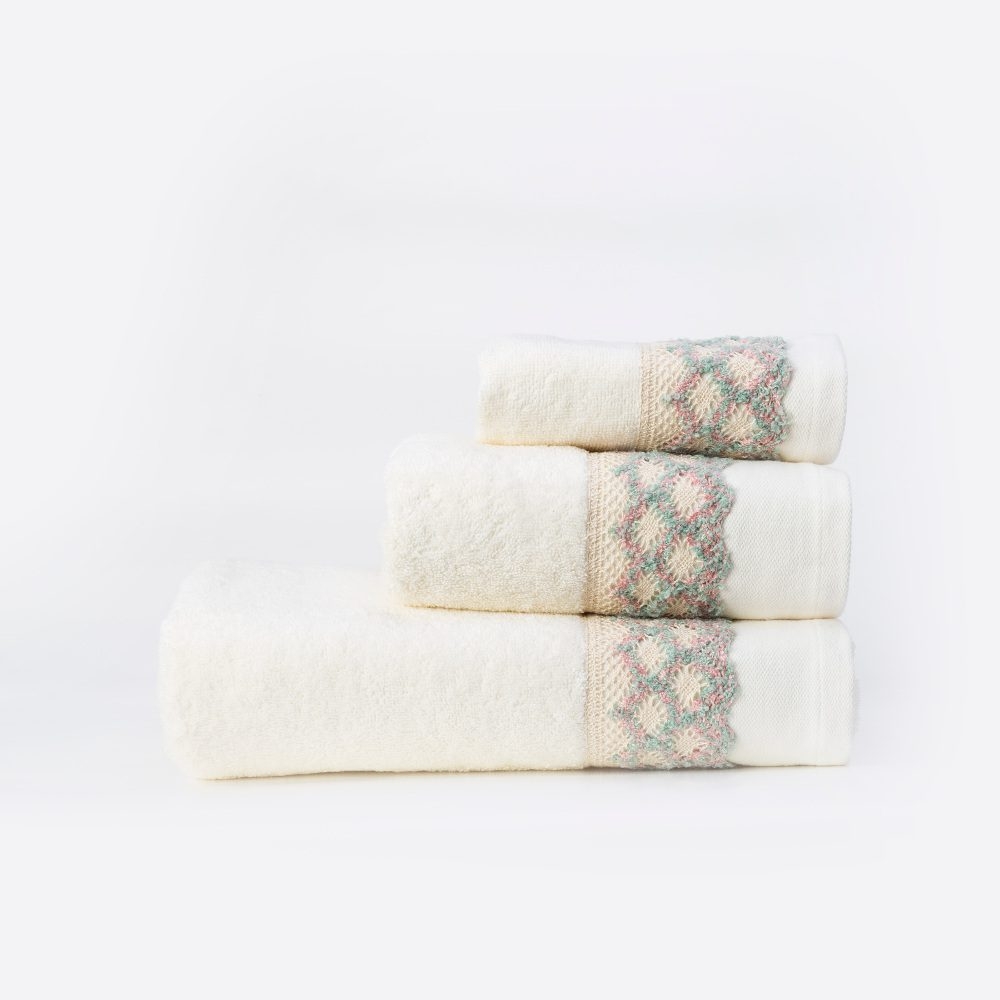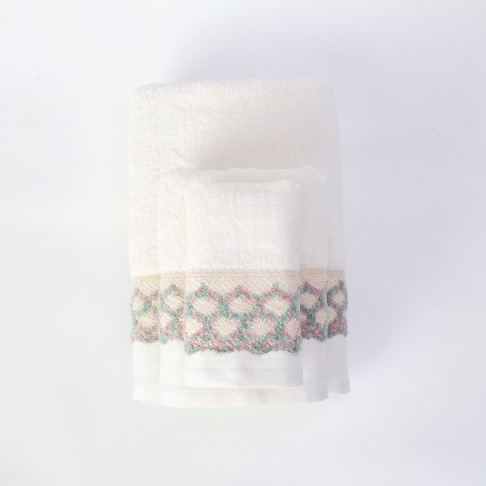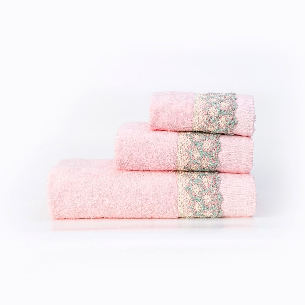 <p>Σετ πετσέτες 3 τεμαχίων, μπάνιου, προσώπου και χειρός, από ύφασμα φροτέ, πενιέ, 100% βαμβακερό, με διακοσμητική πλεχτή δαντέλα.Διατίθεται σε 3 χρώματα.</p>