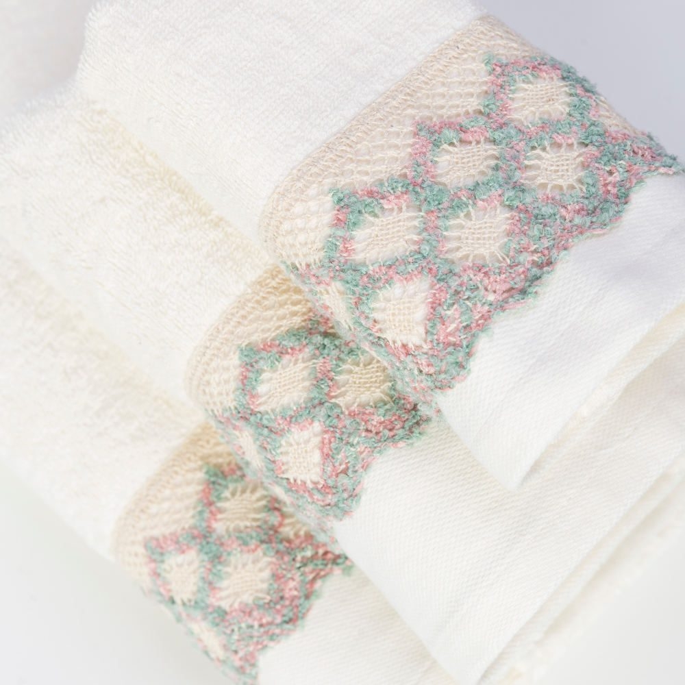 <p>Σετ πετσέτες 3 τεμαχίων, μπάνιου, προσώπου και χειρός, από ύφασμα φροτέ, πενιέ, 100% βαμβακερό, με διακοσμητική πλεχτή δαντέλα.Διατίθεται σε 3 χρώματα.</p>