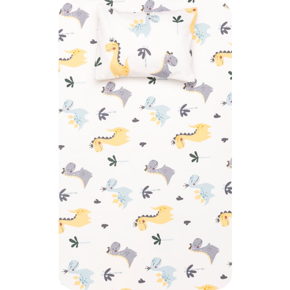 <p>Σετ σεντόνια κούνιας με μαξιλαροθήκη από ύφασμα φανέλα, 100% βαμβακερό, εμπριμέ, χρώμα λευκό, σχέδιο δεινόσαυρος.</p>