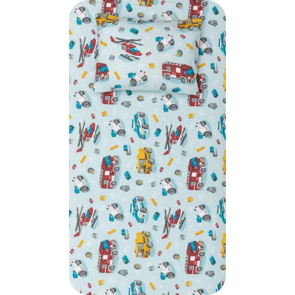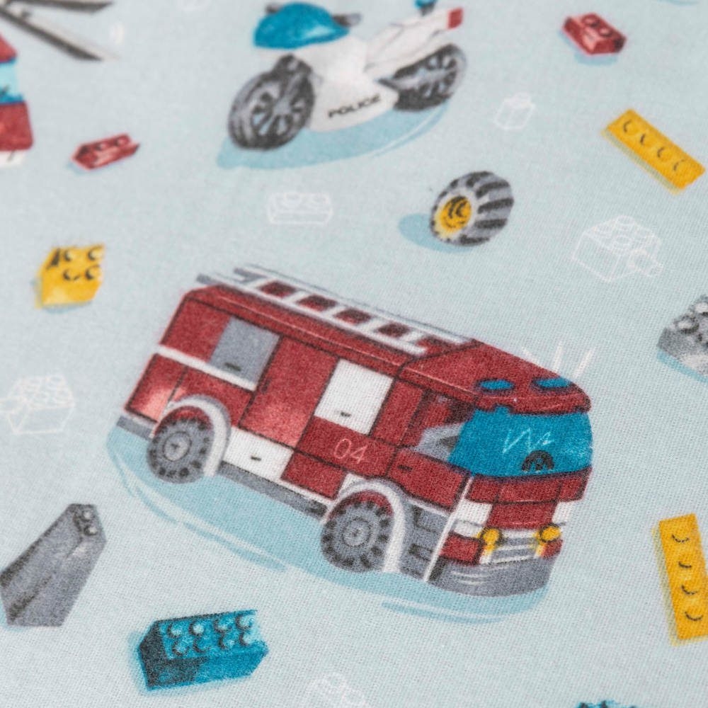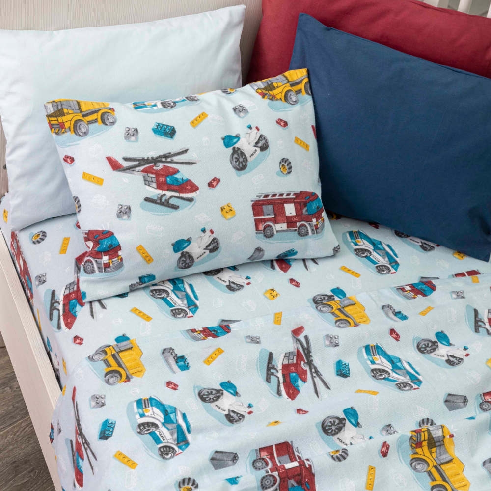 <p>Σετ σεντόνια κούνιας με μαξιλαροθήκη από ύφασμα φανέλα, 100% βαμβακερό, εμπριμέ, χρώμα σιέλ, σχέδιο πυροσβεστική.</p>