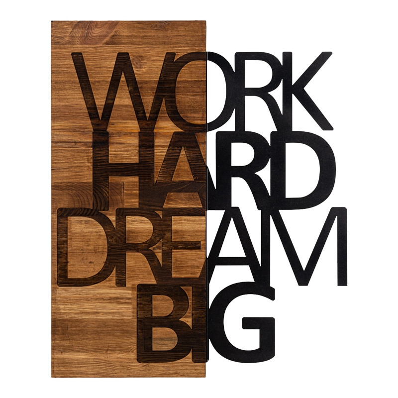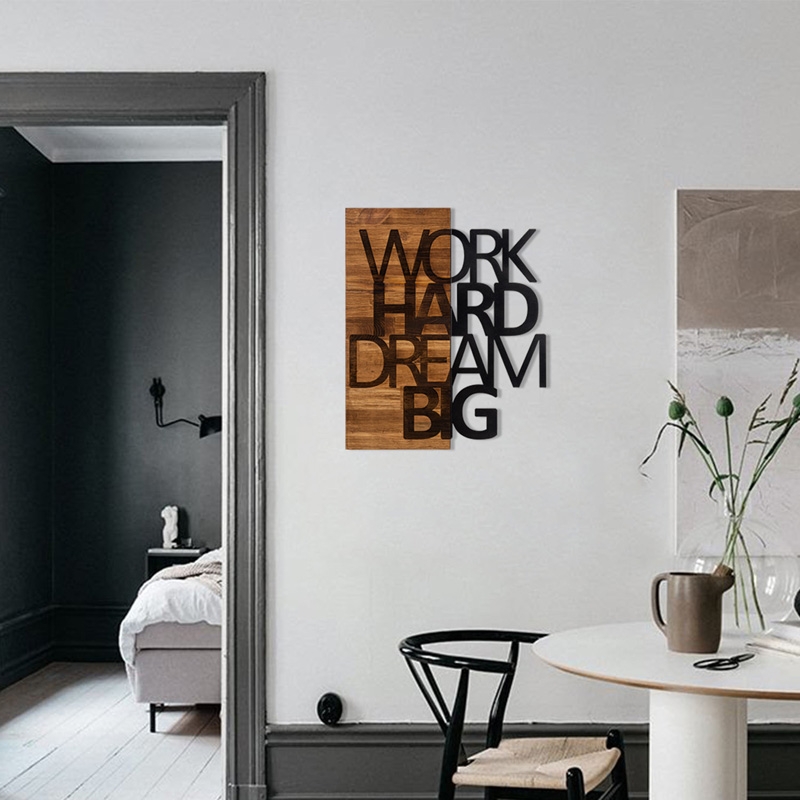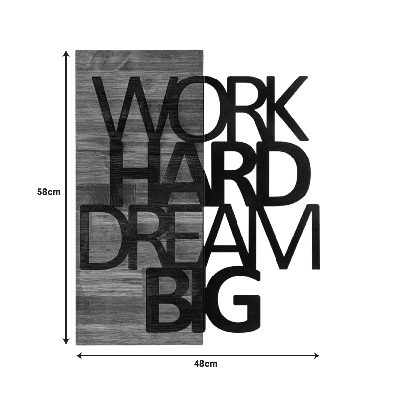 Ανεβάστε την ενέργεια και τη θετικότητα του χώρου σας με αυτό το μοναδικό ξύλινο διακοσμητικό τοίχου! Οι λέξεις "WORK HARD DREAM BIG" αποτυπωμένες με στυλ σε φυσικό ξύλο, αποτελούν μια καθημερινή υπενθύμιση για να κυνηγάτε τους στόχους σας με πάθος και αφοσίωση. Ιδανικό για το σπίτι, το γραφείο ή οποιονδήποτε χώρο θέλετε να εμπνεύσετε. Προσθέστε μια πινελιά ζεστασιάς και motivation στον τοίχο σας! Κάντε το δικό σας και δώστε ώθηση στα όνειρά σας!<br><br><strong>Τεχνικά χαρακτηριστικά:</strong><br>