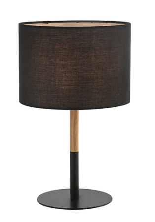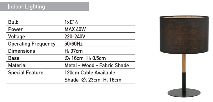 <p><span style="font-size:14px"><span style="font-family:verdana,geneva,sans-serif">Επιτραπέζιο φωτιστικό με λεπτομέρεια από φυσικό ξύλο. Διαθέτει υφασμάτινο καπέλο και μεταλλική βάση σε μαύρη ματ απόχρωση.Δέχεται ένα λαμπτήρα με βάση E14 και μέγιστη ισχύ 40W.</span></span></p>