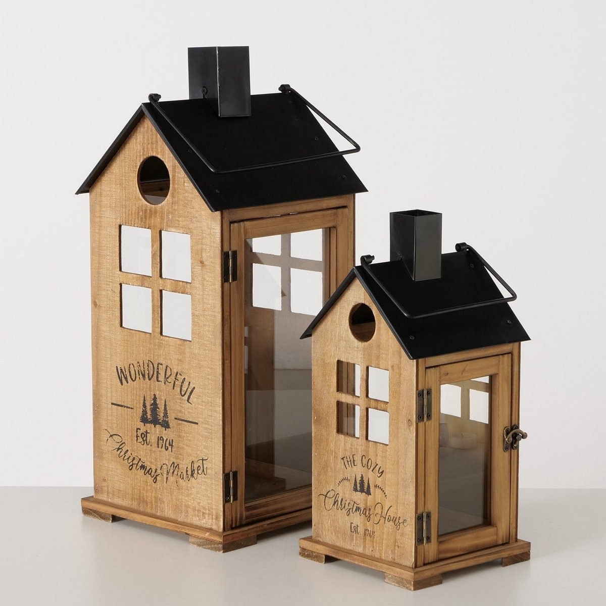 Farmer ξύλινα φανάρια σε σχήμα σπιτιού σε φυσική απόχρωση με μαύρη μεταλλική σκεπή σετ 2 τεμαχίων