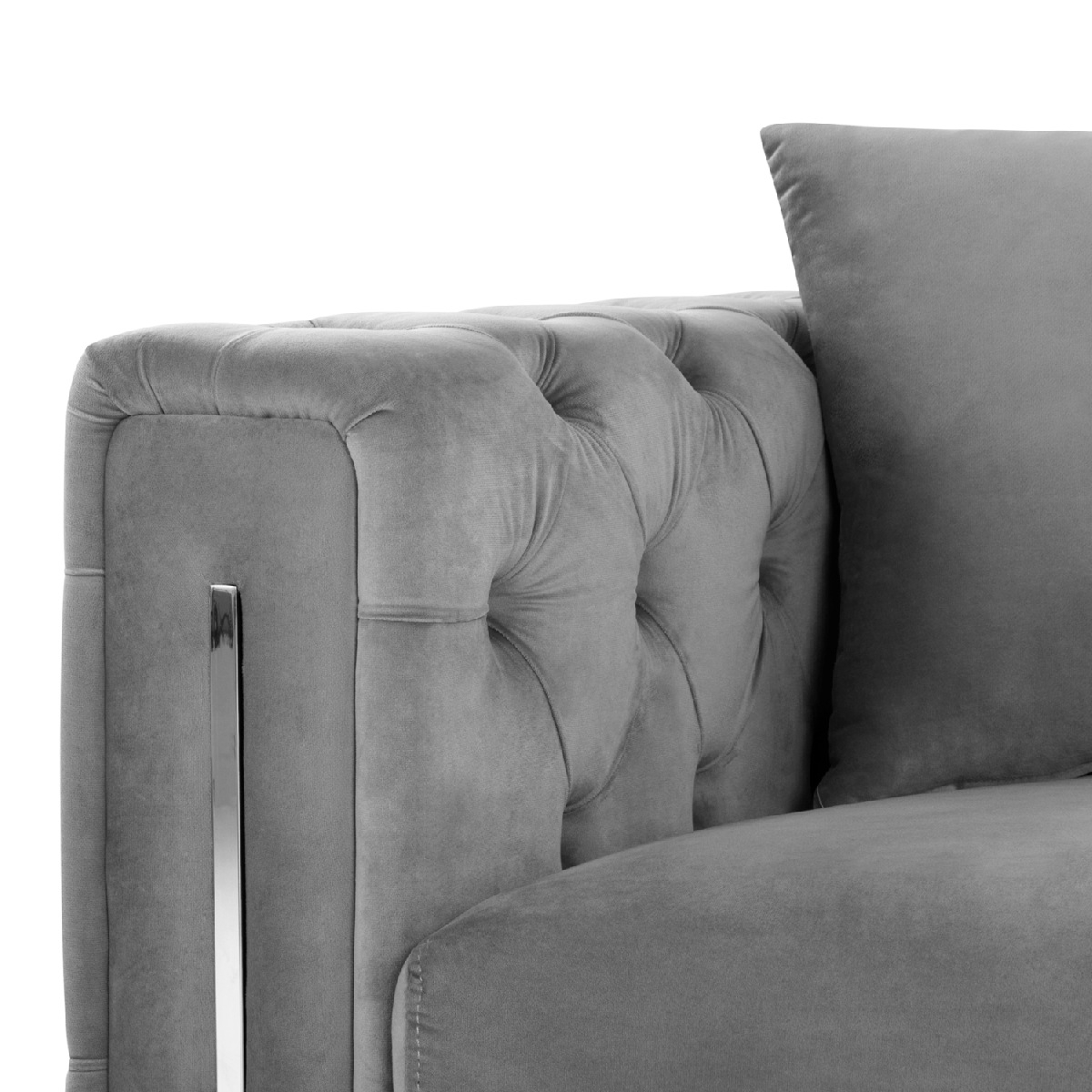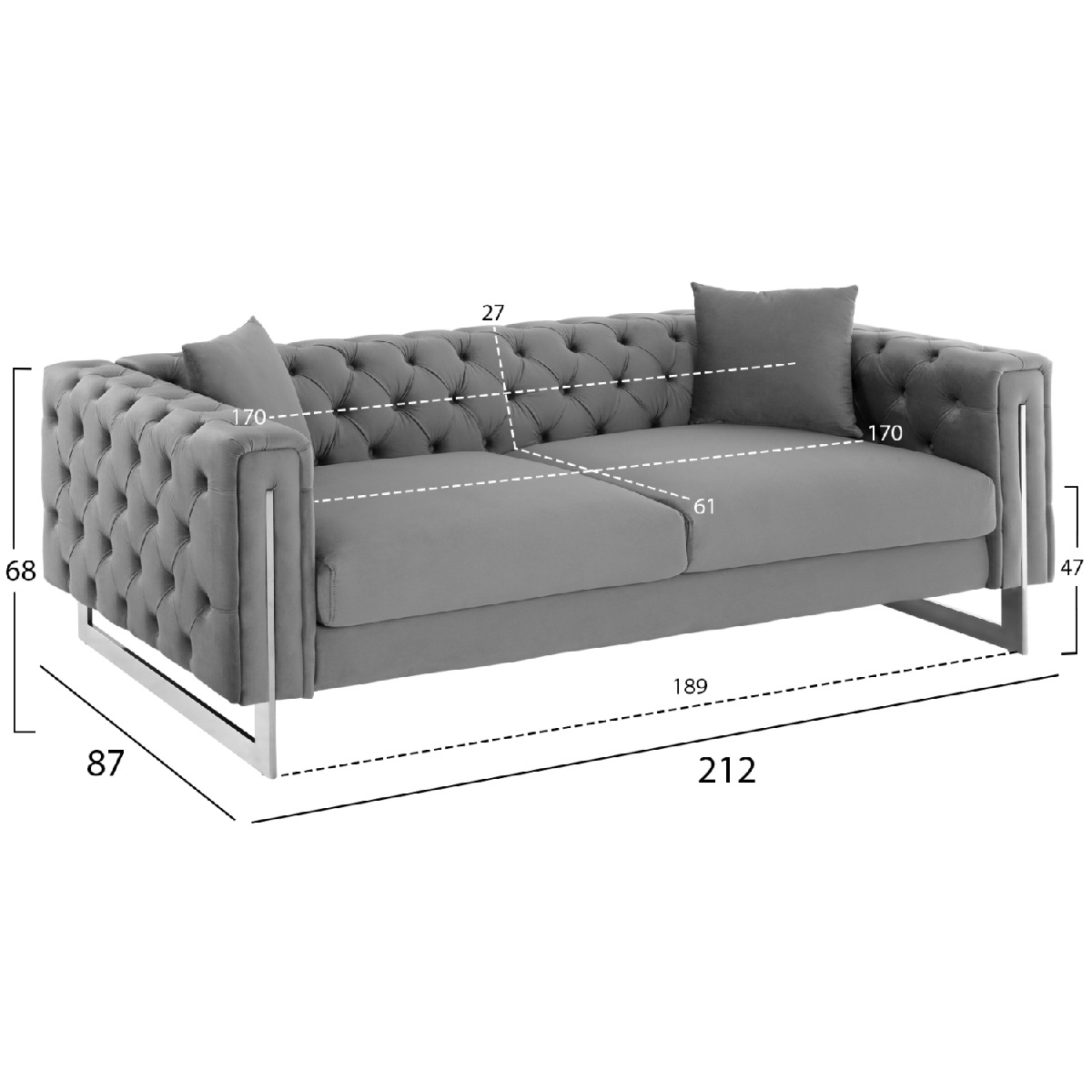 Ο 3-θέσιος καναπές MOBAR σε ΓΚΡΙ χρώμα με μεταλλικά πόδια χρωμιωμένα είναι πανέμορφος. Το χαρακτηριστικό που κάνει αυτόν τον καναπέ να ξεχωρίζει είναι ότι η τεχνοτροπία του είναι σε στυλ Chesterfield, πράγμα που δίνει την αίσθηση κύρους και πολυτέλειας οπουδήποτε κι αν χρησιμοποιηθεί. Όλη η επένδυση έχει γίνει με εξαιρετικής ποιότητας βελούδινο ύφασμα, πράγμα που τον κάνει όμορφο και σημείο αναφοράς στο σαλόνι σας, συνδυάζοντας στιλ και άνεση. Η βαθιά καπιτονέ τεχνοτροπία τόσο στην κοντή πλάτη όσο και στα φαρδιά μπράτσα, υπηρετεί ακριβώς το στυλ Chesterfield.<br />