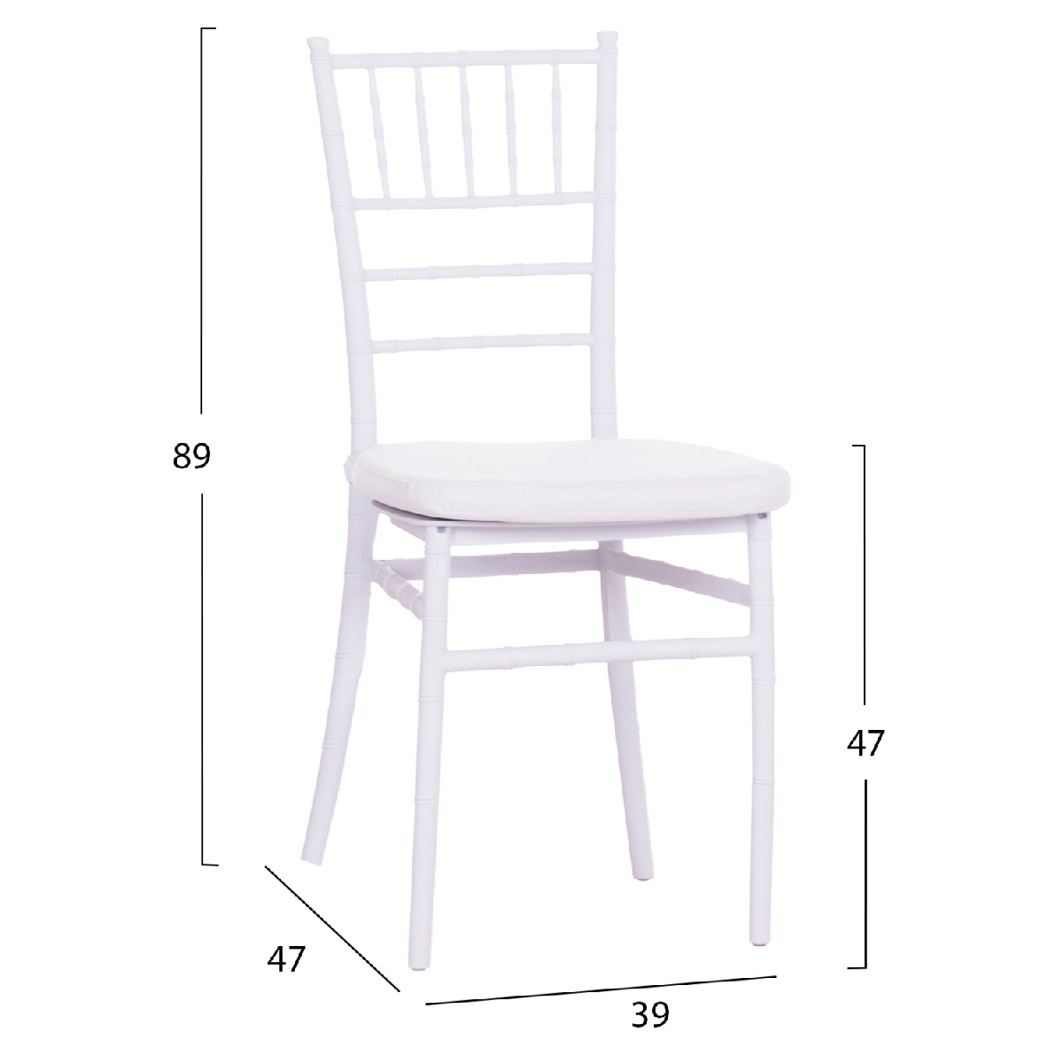 Καρέκλα TIFFANY σε λευκό χρώμα με μαξιλάρι καθίσματος. Ιδανική πρόταση για χρήση σε επαγγελματικούς χώρους (χώροι δεξιώσεων, εταιρείες catering, κλπ.). Η καρέκλα διαθέτει λεπτομέρειες τόσο στις οριζόντιες όσο και στις κάθετες δοκούς της πλάτης, αλλά και στα πόδια. Φυσικά, μια τέτοια καρέκλα είναι και ΣΤΟΙΒΑΖΟΜΕΝΗ πράγμα που την κάνει ιδιαιτέρως πρακτική. Το μαξιλάρι καθίσματος δένεται στην καρέκλα με VELCRO (χρατς) ιμάντες, ενώ διαθέτει αναπαυτικό αφρώδες γέμισμα και επένδυση με υδατοαπωθητικό ύφασμα!<br />