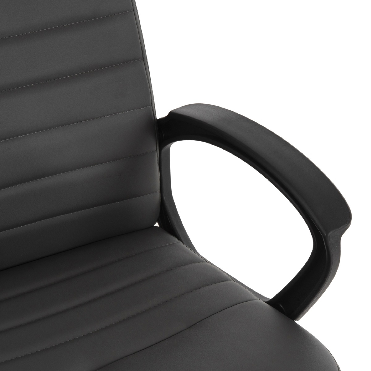 Η THEONI σε ΓΚΡΙ χρώμα είναι μια όμορφη καρέκλα γραφείου με ΜΑΥΡΑ μπράτσα από πολυπροπυλένιο. Η πλάτη είναι μεσαίου ύψους και με πλούσια στρώση από αφρώδη υλικά για άνεση κατά την χρήση, ενώ είναι επενδυμένη με υψηλής ποιότητας PU δέρμα, όπως επίσης και το αναπαυτικό κάθισμα. Η βάση είναι μαύρη σε σχήμα «αστέρι» και τα ροδάκια επίσης σε μαύρο χρώμα. <br />