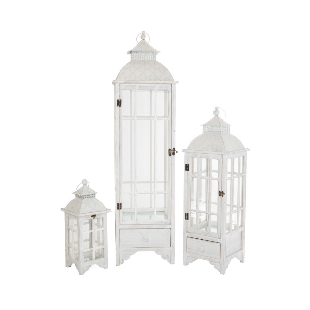 Ξύλινα διακοσμητικά φανάρια σε λευκό χρώμα με τζαμάκια και ένα μικρό συρτάρι σετ τριών τεμαχίων