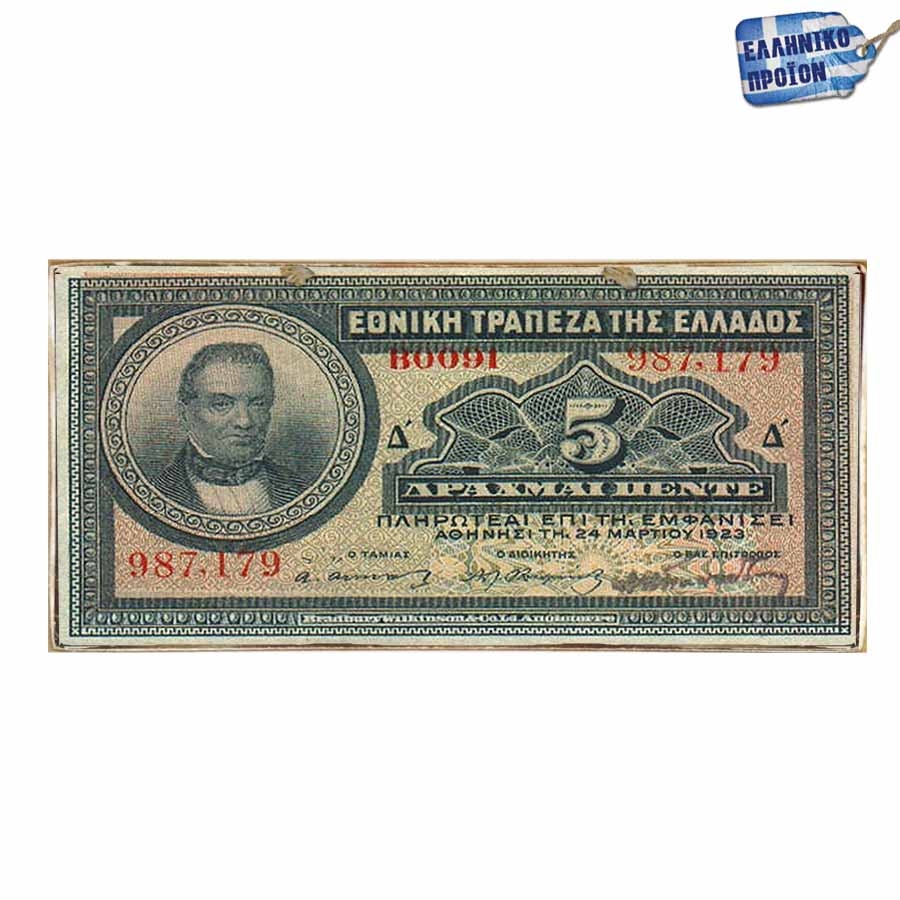 Ξύλινος πίνακας χαρτονόμισμα 5 δραχμές του 1923 26x13 εκ