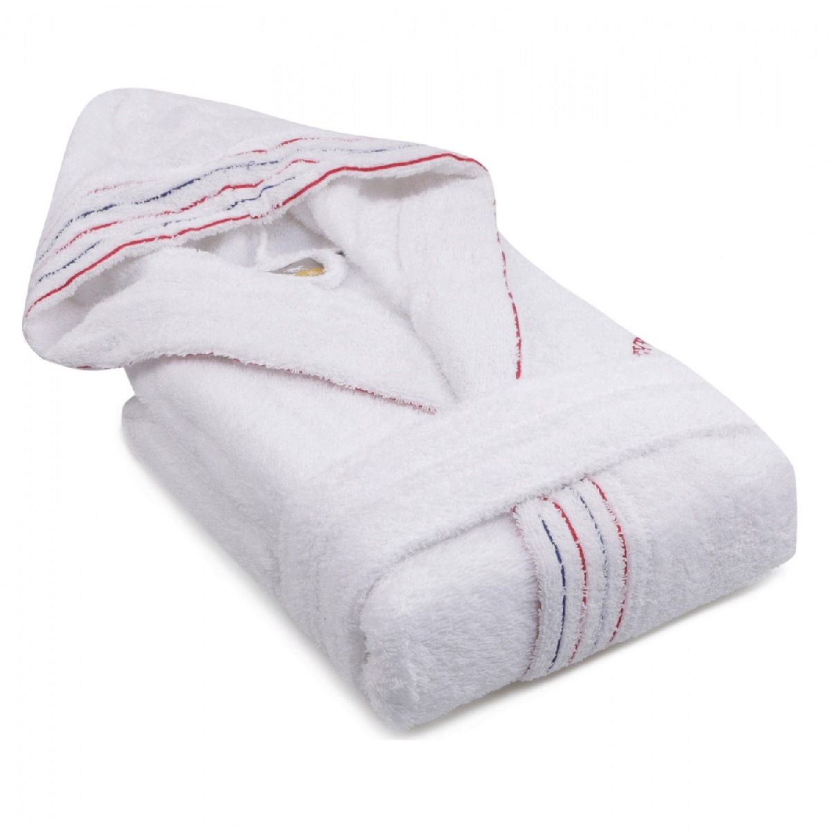 Πρόκειται για ένα μπουρνούζι, κατασκευασμένο από 98% βαμβάκι και 2% πολυεστέρα, 360gsm, σε λευκή απόχρωση με κόκκινες και μπλε ρίγες.<br />