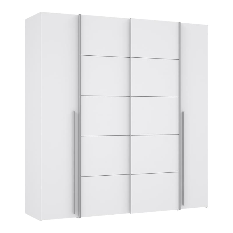 <p>Τεχνικά χαρακτηριστικά:<br />* Κατασκευή από μοριοσανίδα με επένδυση μελαμίνης υψηλής ποιότητας με μεγάλη ανθεκτικότητα σε φθορά και χρόνο. Η μοριοσανίδα είναι γνωστή για την αντοχή της σε φορτία και πίεση. Αυτή η ιδιότητα την καθιστά κατάλληλη για την κατασκευή επίπλων όπως οι ντουλάπες.<br />* Προσφέρεται σε λευκό χρώμα.<br />* Διαθέτει δύο συρόμενες και δύο ανοιγόμενες πόρτες για μεγαλύτερη εξοικονόμιση χώρου.