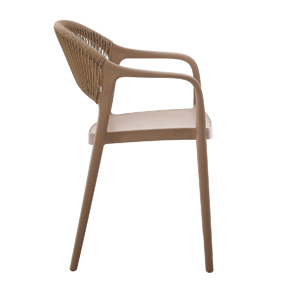 Η πολυθρόνα EVA έχει όλα όσα θα θέλατε από ένα τέτοιο έπιπλο. Όλη η πολυθρόνα είναι από μονοκόμματο πολυπροπυλένιο σε ΚΑΠΟΥΤΣΙΝΟ χρώμα με ελαφρώς κυρτή πλάτη επενδυμένη με συνθετικό σχοινί σε ΜΠΕΖ χρώμα, και πρακτικά μπράτσα. Όλη η κατασκευή είναι ελαφριά και άνετη, και θα γίνει το αγαπημένο κάθισμα σε όποιο χώρο κι αν τοποθετηθεί χάρη στην πρακτικότητά του. Ιδανική επιλογή και για επαγγελματική χρήση, όπως σε catering κτλ., επειδή είναι στοιβαζόμενη.<br />