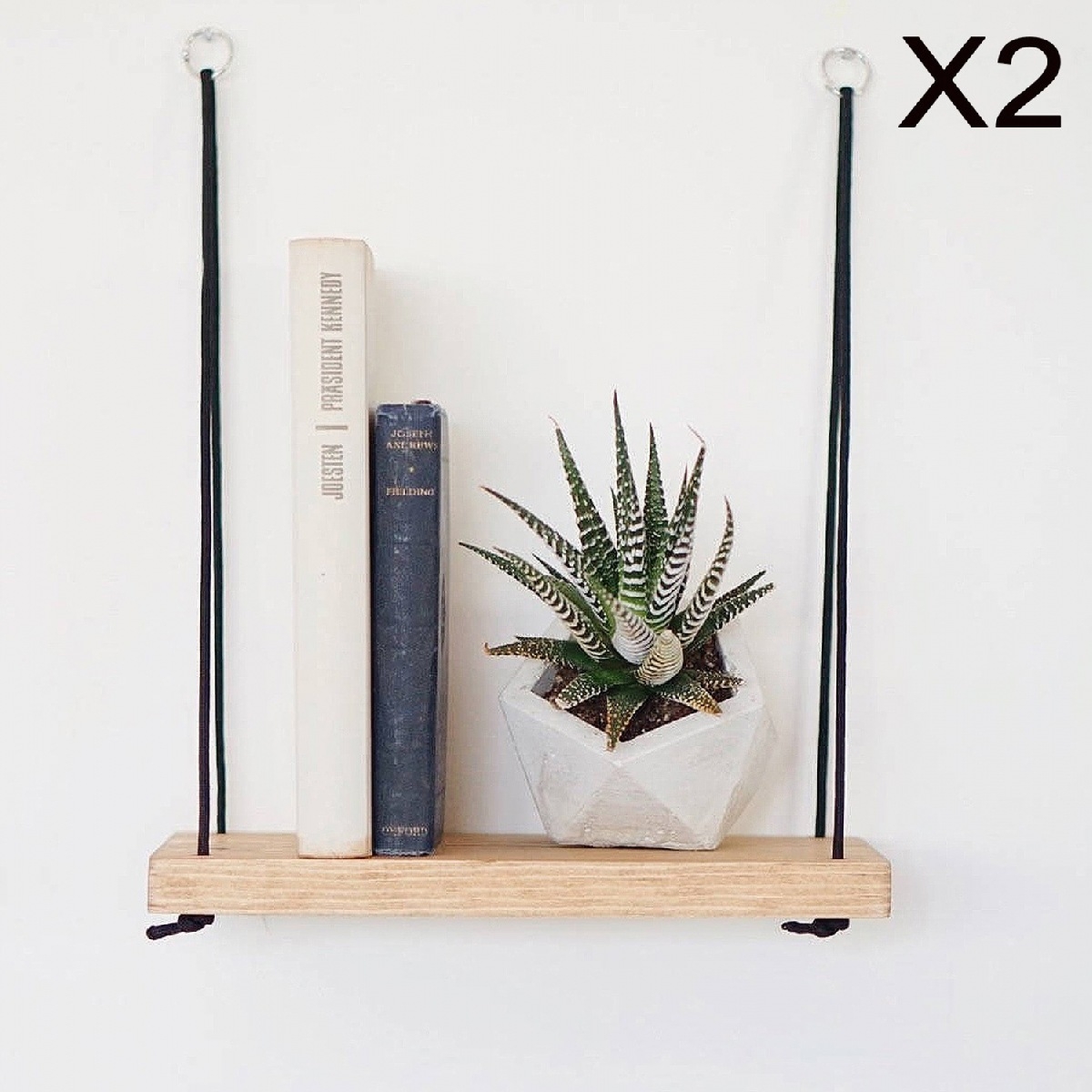 Ραφιέρα τοίχου από ξύλινη βάση σε φυσική απόχρωση και μαύρο σχοινί.<br />