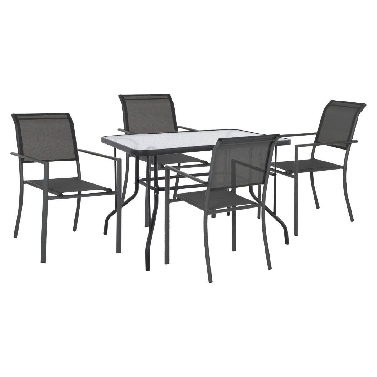 ΗΜ11805—Σετ εξωτερικού χώρου με τραπέζι με ΓΚΡΙ μεταλλικό σκελετό και γυάλινη θολή ΕΝΙΣΧΥΜΕΝΗ επιφάνεια και 4 πολυθρόνες αλουμινίου με textilene σε ΓΚΡΙ χρώμα. <br />