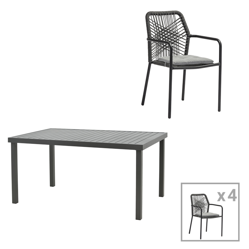 Θέλετε ένα ανθεκτικό σετ τραπεζαρίας για το μπαλκόνι ή τον κήπο σας που θα αναβαθμίσει αισθητικά το χώρο σας; Η σειρά Kherson-Kliton A είναι ιδανική για εσάς καθώς συνδυάζει την αισθητική με την ποιότητα κατασκευής.<br><br><strong>Το σετ αποτελείται από τέσσερις πολυθρόνες και ένα τραπέζι.</strong><br><br><strong>Τεχνικά χαρακτηριστικά τραπεζιού:</strong><br> •Κατασκευή από αλουμίνιο. Το αλουμίνιο είναι ένα εξαιρετικά ανθεκτικό υλικό για εξωτερική χρήση, καθώς αντέχει στις καιρικές συνθήκες χωρίς να διαβρώνεται ή να σκουριάζει. Είναι επίσης ελαφρύ και εύκολο στη μετακίνηση, κάνοντάς τον ιδανικό για εξωτερικούς χώρους. <br>• Προσφέρεται σε χρώμα ανθρακί. Το ανθρακί χρώμα προσδίδει στον τραπέζι μια σύγχρονη και κομψή εμφάνιση που εναρμονίζεται εύκολα με διάφορα στυλ διακόσμησης εξωτερικών χώρων. Η απλότητα και η κομψότητα του μαύρου χρώματος τονίζει τον χώρο και προσθέτει μια νότα διαχρονικής κομψότητας.<br><br><strong>Διαστάσεις τραπεζιού:</strong><br>•Μήκος: 150 εκ.<br>•Πλάτος: 80 εκ.<br>•Ύψος: 74 εκ.<br><br><strong>Τεχνικά χαρακτηριστικά πολυθρόνας:</strong><br>•Σταθερός σκελετός από εξαιρετικής ποιότητας αλουμίνιο (Dia.25xT1.8mm) με αντοχή στην καταπόνηση και στη φθορά.<br>•Η πλάτη είναι κατασκευασμένη από olifin σχοινί 6mm , ανθεκτικό στις ακτινοβολίες UV. <br>•Περιλαμβάνει μαξιλάρι για την έδρα του καθίσματος με foam 3εκ, αφαιρούμενο κάλυμμα και ύφασμα polyester. <br>•Κατάλληλο για χρήση σε εσωτερικούς ή στεγασμένους εξωτερικούς χώρους. <br>•Στοιβάζεται χωρίς το μαξιλάρι <br>•Χρώμα: αλουμίνιο ανθρακί-σχοινί ανθρακί-μαξιλάρι γκρι<br><br><strong>Διαστάσεις πολυθρόνας:</strong><br>•Μήκος: 55 εκ.<br>•Πλάτος: 61 εκ.<br>•Ύψος: 84 εκ.<br>•Ύψος έδρας: 42 εκ.<br>•Βάθος έδρας: 43 εκ.<br>•Ύψος πλάτης: 42 εκ.<br><br><strong>Πληροφορίες υλικών:</strong><br>•Rope: Το Rope (σχοινί) αναφέρεται σε μια συλλογή ινών που πλέκονται μαζί για να δημιουργήσουν ένα εύκαμπτο, αλλά δυνατό και ανθεκτικό υλικό. Τα σχοινιά κατασκευάζονται από διάφορα υλικά, συμπεριλαμβανομένων των φυσικών ινών όπως βαμβάκι, λινάρι.<br>•Alu: Το υλικό "ALU" αναφέρεται στο αργίλιο (Aluminum), το οποίο είναι το τρίτο πιο κοινό στοιχείο στη γη και το πρώτο πιο κοινό μέταλλο. Το αλουμίνιο δημιουργεί ένα προστατευτικό οξειδωτικό στρώμα όταν έρχεται σε επαφή με τον αέρα, προστατεύοντας από τη διάβρωση, ενώ παράλληλα είναι πλήρως ανακυκλώσιμο χωρίς να χάσει τις ιδιότητές του, κάνοντάς το ένα πολύ βιώσιμο υλικό.<br><br><strong>Οδηγίες συντήρησης: </strong><br>•Rope: Η καθαριότητα και η συντήρηση του σχοινιού εξαρτάται από το υλικό από το οποίο κατασκευάζεται. Γενικά, τα σχοινιά πλένονται με ζεστό νερό και ήπιο απορρυπαντικό. Τα σχοινιά από συνθετικές ίνες είναι ανθεκτικά στην υγρασία και συνήθως δεν απαιτούν ειδική συντήρηση.<br>• Alu: Χρησιμοποιείστε ένα υγρό πανί με μικροΐνες, βρεγμένο με νερό. Αν το αλουμίνιο έχει πολλά υπολείμματα, όπως σκουριά ή λεκέδες, χρησιμοποιήστε ήπιο απορρυπαντικό ή καθαριστικό για να τα απομακρύνετε.<br><strong><br>Παρατηρήσεις:</strong><br>•Το προϊόν παραδίδεται σε εργοστασιακή συσκευασία.<br>•Η χρωματική απόχρωση του προϊόντος ενδέχεται να διαφέρει ελαφρώς σε σχέση με την φωτογραφική απεικόνισή του στην οθόνη σας.<br><br><br>