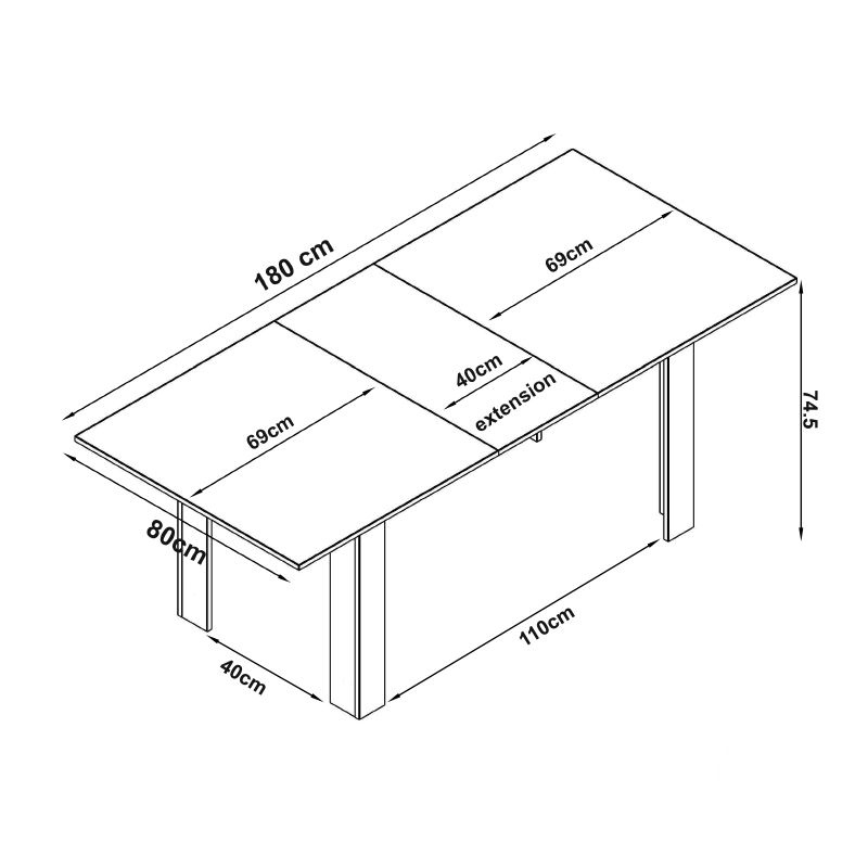<li>Διαστάσεις: Μήκος 138 - 178 x Βάθος 80 x Ύψος 74 εκ.</li>