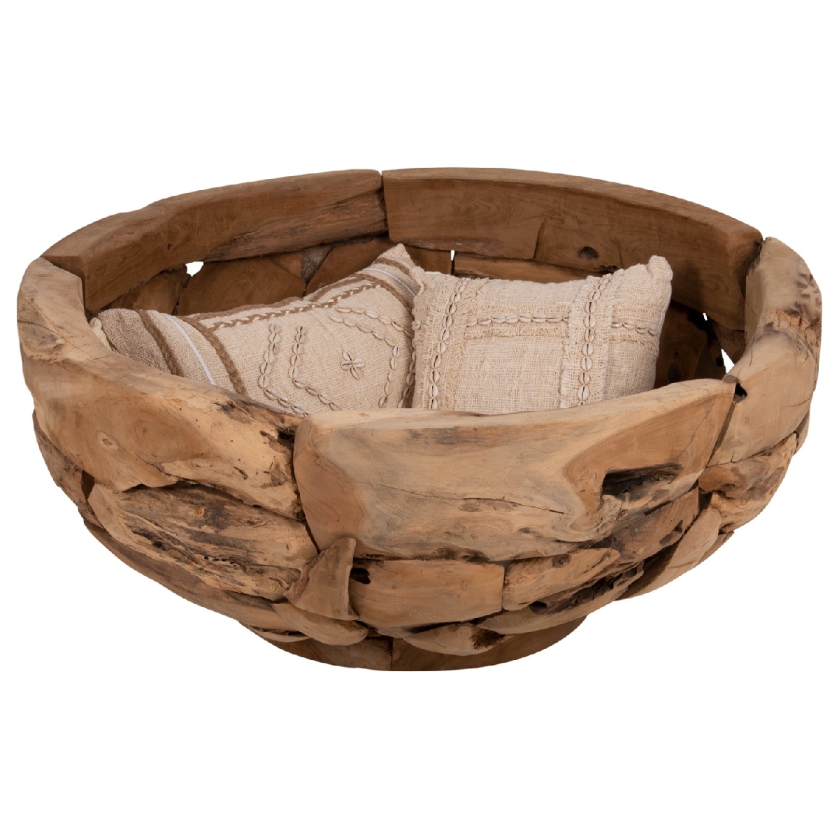 Σας παρουσιάζουμε το υπέροχο τραπέζι σαλονιού HM4279. Πρόκειται για ένα χαμηλό και στρογγυλό τραπέζι από φυσικά κομμάτια ποιοτικού ξύλου ΤΕΑΚ χωρίς πόδια. Στηρίζεται σε μια βάση από τα ίδια ξύλα και έχει την μορφή ενός μεγάλου μπολ. Στο εσωτερικό μπορείτε να τοποθετήσετε διάφορα αντικείμενα ή διακοσμητικά για να δώσετε την εικόνα που θέλετε στον χώρο σας, όπως διακοσμητικές γυαλισμένες πέτρες διαφόρων χρωμάτων, ή μαξιλάρια, ή οτιδήποτε άλλο. Η γυάλινη επιφάνεια ΔΕΝ περιλαμβάνεται στο πακέτο για λόγους ασφαλείας.<br />