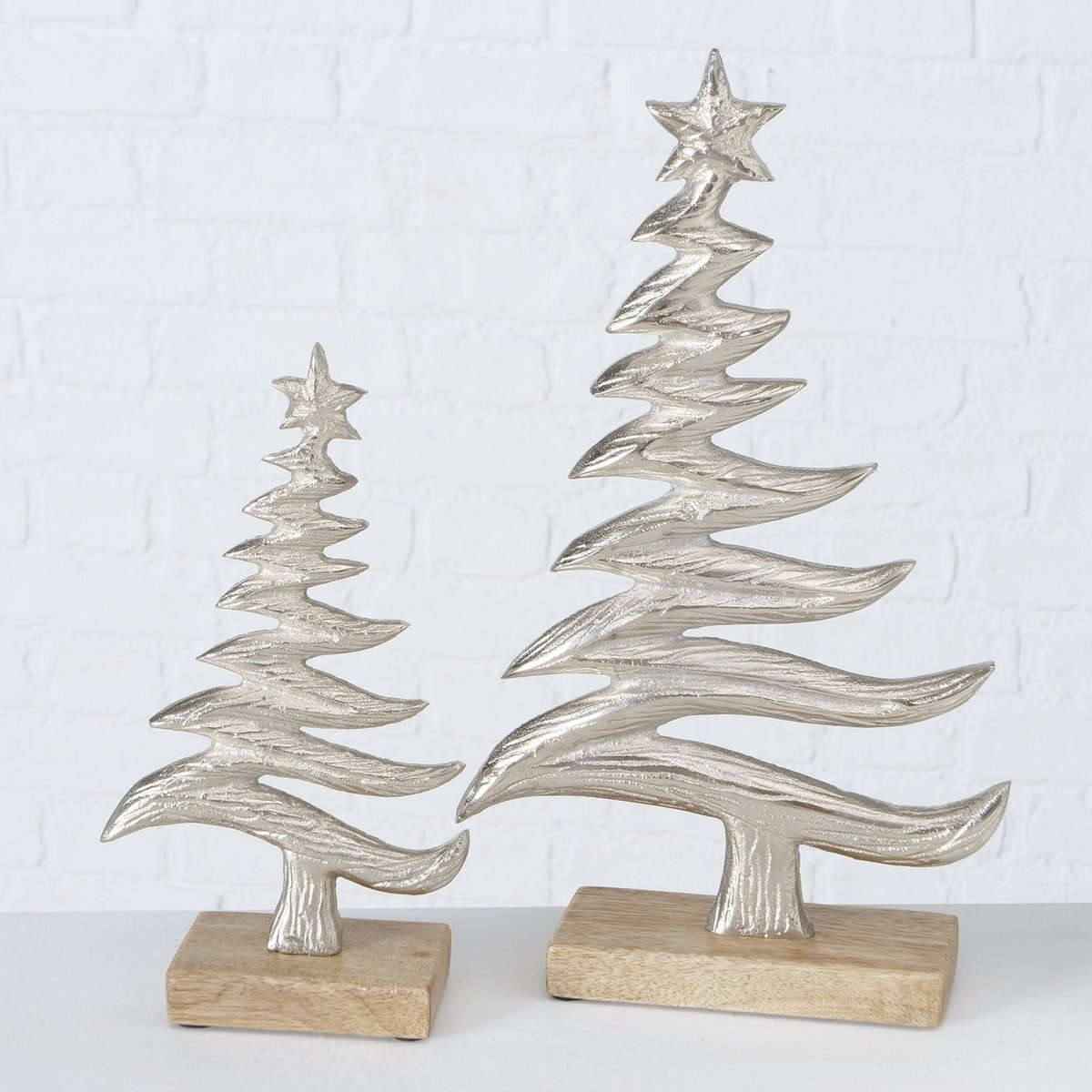 Χριστουγεννιάτικα μεταλλικά διακοσμητικά δεντράκια σε ασημί απόχρωση με ξύλινη βάση σετ δύο τεμαχίων