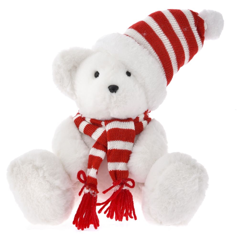 Χριστουγεννιάτικο λευκό αρκουδάκι με κόκκινο κασκόλ και σκούφο 19x25x22 εκ